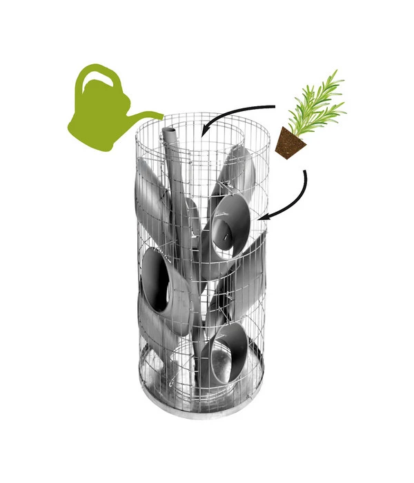 Der bellissa Kräuterturm bietet Platz für insgesamt 10 Pflanzen. In den wetterfesten Kunststoffeinsätzen können Sie ganz nach Ihrem Geschmack die verschiedensten Kräuter platzieren. Ein integriertes Gießrohr sorgt für die optimale Bewässerung des Miniatur-Gartens. Die senkrecht verlaufende Gießvorrichtung unterstützt das innovative Pflanzkonzept des bellissa Kräuterturms. Die Pflanznischen sind rings um den Turm auf verschiedenen Höhen angelegt. Damit entstehen auf kleinstem Raum verschiedenste Klimazonen, die ein gesundes Wachstum befördern. Dabei sollten die Pflanzen, die ein feuchtes Klima lieben, in die unteren Pflanzlöcher gesetzt werden, da die Bodenfeuchte im bellissa Kräuterturm nach oben hin abnimmt. Bei der Bepflanzung sollten Sie weiterhin den wandernden Sonnenstand während des Tagesverlaufs beachten. Manche Kräuter brauchen einen sonnigen Platz, während andere besser im Schatten oder Halbschatten gedeihen.
