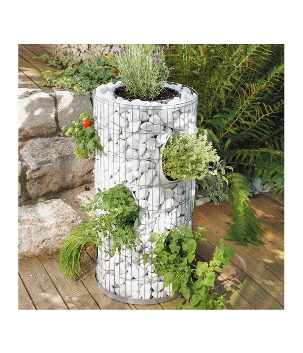 Der bellissa Kräuterturm im Durchmesser 40 x 80 cm vereint viele Eigenschaften, die ihn zu einer echten Bereicherung in Ihrem Garten werden lassen. Zuerst fällt die ungewöhnliche Form ins Auge, die sich vertikal über dem Boden erhebt. Da der bellissa Kräuterturm mit einer Trennfolie, aber ohne Steine und Pflanzen geliefert wird, sind Sie in der Gestaltung völlig frei. Je nach Auswahl des Steinbedarfs von 90 kg können ganz individuelle Muster erzeugt werden. Das ummantelnde Stahldrahtgeflecht mit einer Maschenweite von 25 x 100 mm, des bellissa Kräuterturms, welches durch eine Verzinkung besonders witterungsunempfindlich ist, sorgt für die nötige Stabilität.