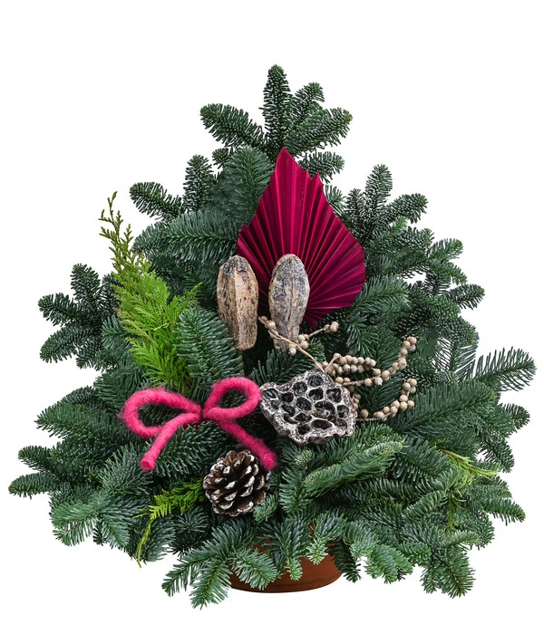 Möchten Sie einem geliebten Menschen auf eine besondere Art gedenken? Das klassisch gestaltete Grabgesteck in Terrakotta-Schale verbindet die Schönheit der Natur mit einer schlichten Verzierung. Die erfahrenen Floristen haben sorgfältig frische Nobilis- und Thujazweige per Hand zusammengebunden und mit hochwertigen Naturmaterialien in leuchtenden Farben kunstvoll bestückt. So setzen das getrocknete Palmblatt sowie die Schleife aus flauschiger Wolle kontrastreiche Akzente und verleihen der Kreation eine elegante Note. Die witterungsbeständige Terrakotta-Schale sorgt für einen festen Stand, sodass das Gesteck die Grabstätte den ganzen Winter lang gepflegt und schön aussehen lässt.