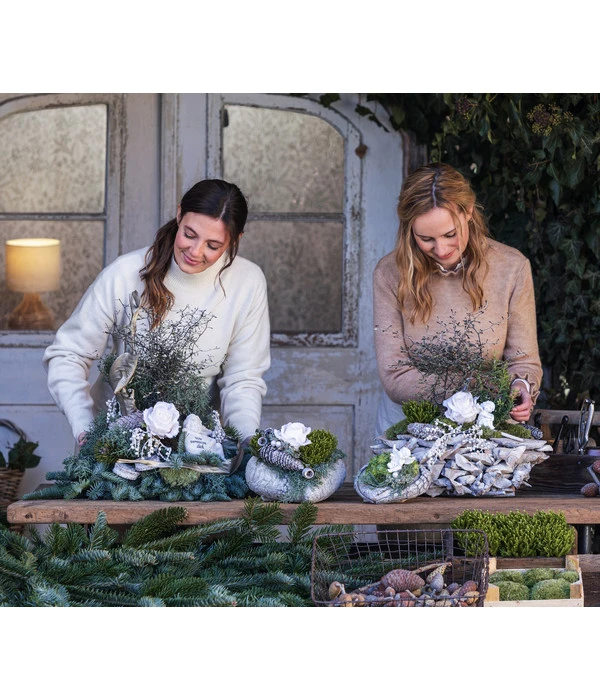 Für alle, die mal keinen Kranz und kein Gesteck auf die Grabstätte legen möchten, ist das erlesene Grabherz Stille genau das Richtige. Natürlich schöne Materialien wie immergrüne Hauswurz, frische Arizonika- und Flechtenzweige sowie eine weiße Perle fügen sich zu einem reizvollen Potpourri, das von einem wetterfesten Pflanzenherz aus Beton umfangen wird. Seinen besonderen Reiz erhält das Gesteck Stille durch den naturnahen Look, der den Grabschmuck wirken lässt, als wären die Deko-Elemente frisch während einem Spaziergang durch den Wald gesammelt. Ein Effekt, der bis ins neue Jahr noch genauso schön aussehen wird wie an den Gedenktagen im November.