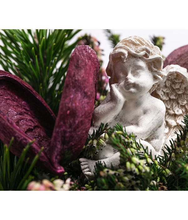 So klein das Grabgesteck Unvergessen auch ist, an Ausdruckkraft und Symbolstärke lässt es nichts vermissen. Denn im Zentrum wurde eine kleine Engelsfigur im Stil einer barocken Putte platziert, wie sie seit langen als Vermittler zwischen Himmel und Erde, als Tröster, Beschützer und Helfer beliebt sind. Ist es nicht eine tröstliche Vorstellung, dass Sie mit dem Grabgesteck Unvergessen Ihrem lieben Verstorbenen einen himmlischen Helfer zur Seite stellen, der das Grab zu jeder Tages- und Nachtzeit beschützen wird?