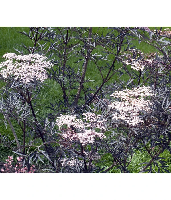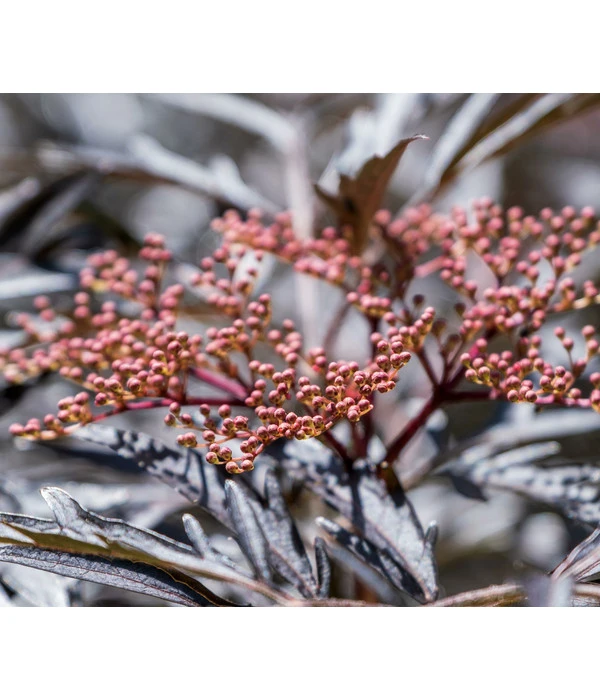Mit diesem außergewöhnlichen Strauch holen Sie sich einen Blüten-, Zier- und Nutzstrauch in den Garten. Der Holunder ‚Black Lace‘ hat kräftig geschlitzte, tief dunkelrote, fast schwarze Blätter. Im Frühjahr trägt er bis zu 15 cm große, rosafarbene Blütendolden, die betörend duften. So eine prächtige Pflanze finden Sie bestimmt nicht in vielen Gärten. ‚Black Lace‘ ist ein Muss für Japangärten und glänzt hier mit seinem besonderen Charme. Durch sein spezielles Aussehen verbreitet er ein exotisches Flair im Garten. Die sehr saftigen Früchte, die er im Herbst trägt, sind glänzend schwarz. Holunder schmeckt herb und etwas bitter. Deshalb wird er meist nicht frisch verzehrt. Erst verarbeitet entfaltet er sein volles Aroma. Sehr bekannt ist der Holundersirup, welcher Cocktails und Säfte aufpeppt.