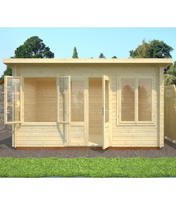 Möchten Sie Ihren Garten einzigartig und funktional gestalten? Dann sollten Sie auf das Palmako Gartenhaus Lisa nicht verzichten. Denn das großzügige Häuschen aus unbehandeltem Fichtenholz lässt sich nicht nur wunderbar in Ihre Gartenanlage integrieren, sondern es sorgt für naturnahe Akzente. Die Konstruktion aus Blockbohlen mit winddichter Chaletschnitt-Eckverbindung besitzt eine natürliche Optik mit Holzmaserung und ist zudem besonders stabil und langlebig. Die hochwertigen Doppelfenster sowie die verglaste Tür sorgen im Innenraum der Hütte für viel Tageslicht. Machen Sie das stilvolle Gartenhaus zum Blickfang in Ihrem Zuhause und es wird garantiert staunende Blicke Ihrer Gäste und Nachbarn auf sich ziehen.