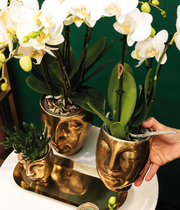 Eine Vase mit ein paar Blümchen hier, ein Blumentopf mit einer netten Pflanze dort – auf die Dauer sind die üblichen Deko-Objekte dann doch eher langweilig. Nicht so mit einem Pflanzen-Arrangement Boutique Chic. Hier dürfen Sie ganz entspannt auf die Erfahrung und Kreativität eines Profis vertrauen, der Accessoires und Pflanzen so auswählt, dass eine harmonische Kombination entsteht, die – wie in diesem Fall – an Ausstrahlung kaum zu übertreffen ist. Ganz im Stil des edlen Boutique Chic wurden hier zwei an Buddha erinnernde Übertöpfe gewählt, die sich mit einer edel goldglänzenden Lackierung präsentieren. Perfekt dazu passend das ebenfalls goldfarbene Metalltablett. Ein wunderbares Zuhause für eine elegante Schmetterlingsorchidee und ein Dickblatt. So kann sich die zweitriebige Orchidee mit den porzellanartigen Blüten in ihrer vollen Pracht entwickeln und es entsteht eine dekorative, glamouröse Gesamtoptik, die überall im Raum die Blicke auf sich zieht. Sie sind spontan begeistert? Dann sollten Sie sich dieses Pflanzen-Arrangement nicht entgehen lassen und bald bei sich glänzen lassen!