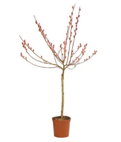 Diese Rotkätzchenweide wurde als Stämmchen gezogen und eignet sich deshalb besonders für die Kübelbepflanzung. Denn so bleibt in einem größeren Kübel noch genügend Raum, um zu Füßen der Rotkätzchenweide weitere Frühlingsblüher wie Hornveilchen, Vergissmeinnicht, niedrige Narzissen und andere zu pflanzen. Ist immer noch Boden unbedeckt, so legen Sie flauschiges Moos darauf und setzen zu Ostern noch einen Deko-Hasen dazu und fertig ist ein reizender Willkommensgruß neben der Haustür.