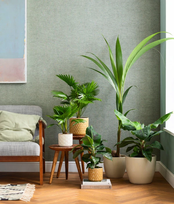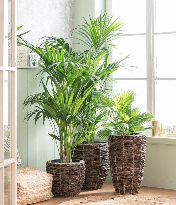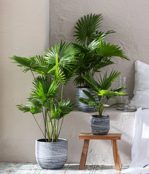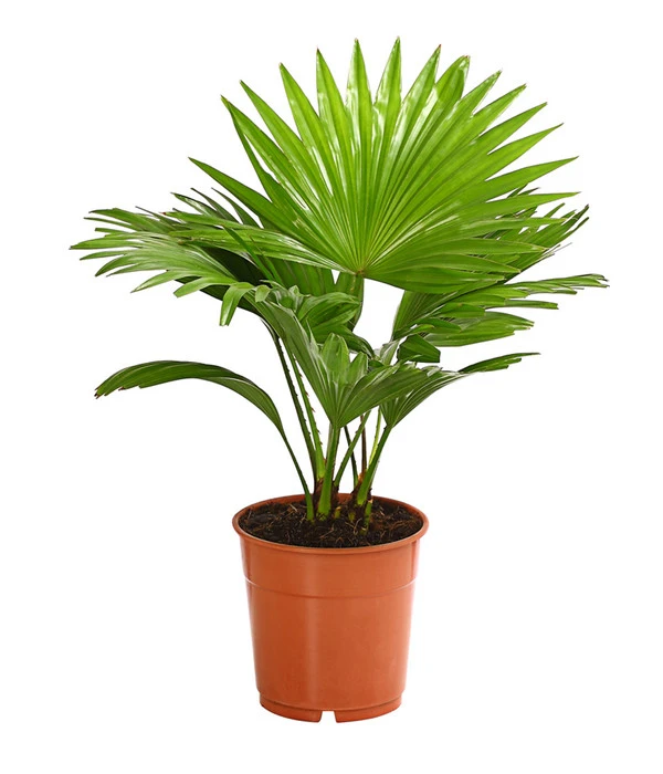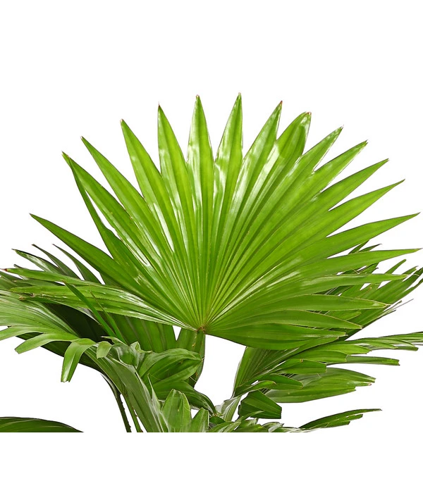 Die Livistonie zählt zu den eher langsam wachsenden Zimmerpalmen, bei guten Standortbedingungen und optimaler Pflege kann diese Zimmerpflanze aber durchaus größere Höhen erreichen. In ihrer Heimat wächst sie im Alter zu einer stattlichen Palme heran, die bis zu 15 Meter hoch werden kann. An den schlanken, mit Stacheln besetzten Blattstielen sitzen große, kreisrunde und gefiederte Blätter. Die einzelnen Fiederblätter sind bis etwa zu zwei Drittel zusammengewachsen und stehen steif über ihren Stielen. Bei genauem Hinsehen erklärt es sich von selbst, warum sie auch oft Fächerpalme genannt wird. Und wen erinnert dieser Name nicht an Urlaub, Sonne und Meer! Mit der Rundblättrigen Schirmpalme holen Sie sich gewiss das Urlaubsfeeling in die eigenen vier Wände.