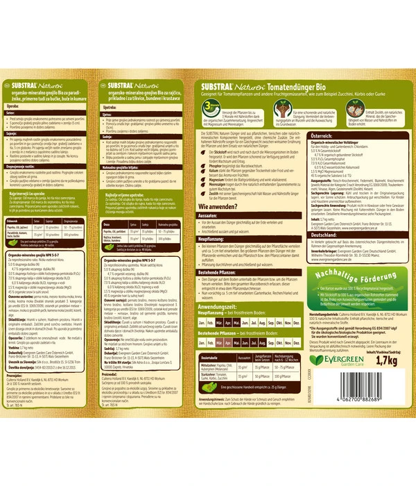 Der Stickstoff im Substral® Naturen® Tomatendünger stammt aus organischen Rohstoffen, was das Risiko von Auswaschungsverlusten minimiert und die Bedürfnisse der Umwelt respektiert; und der Karton wurde aus 100 % Recyclingmaterial hergestellt.