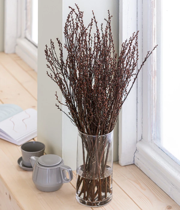 Das Ziergehölz wird genauso behandelt wie ein Strauß mit Frischblumen. Schneiden Sie die Zweige nach dem Kauf frisch an und stellen sie in sauberes Wasser. Für eine besonders lange Blütenfreude empfehlen wir, alle zwei Tage das Wasser zu wechseln und die Zweige nachts in einen kühlen Raum zu stellen. Wenn Sie sich einige Zeit an ihrer Dekoration satt gesehen haben, können Sie den Sumpfkätzchen-Bund auch aus dem Wasser nehmen und trocknen lassen. Erfahrene Floristen nehmen trockene Sumpfkätzchen-Zweige das ganze Jahr über als dekoratives Beiwerk zu den verschiedensten Frisch- und Trockenblumen-Gebinden.